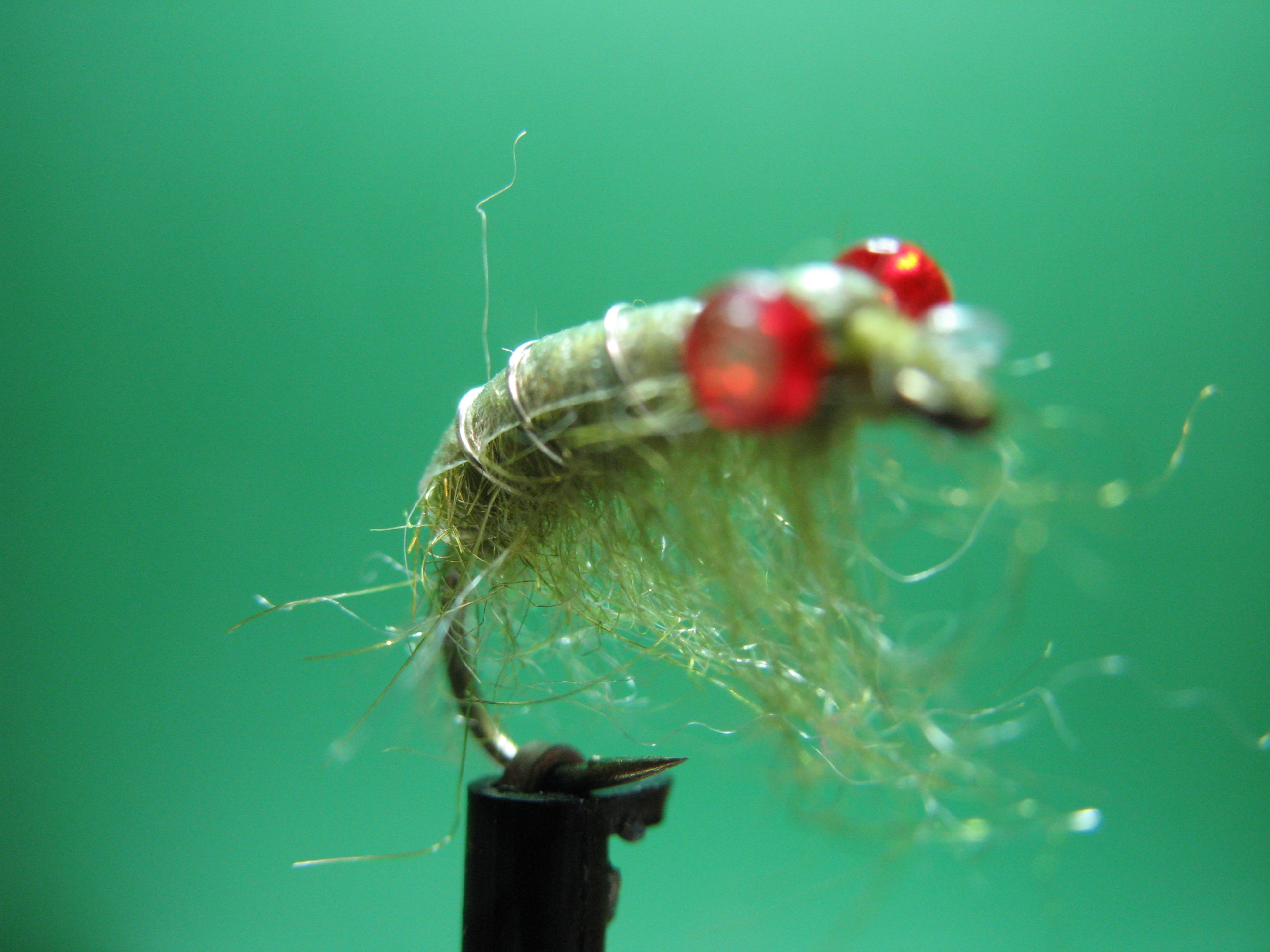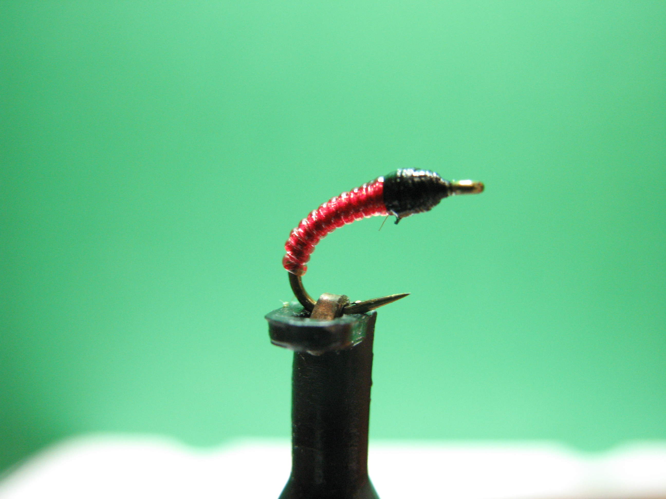 This fly just works for me. I tie it with a red, green, or tan body with a black head, or all black. Drift it behind a larger nymph. Bead-eyed Sc