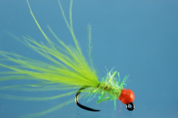 The Micro Bugger is a simple little fly that has a huge personality. The jig hook keeps it point up, avoiding snags. A pinch of marabou for the tail with matching Micro Polar Chenille for the body is in sharp contrast to the Fluorescent Orange tungsten bead.